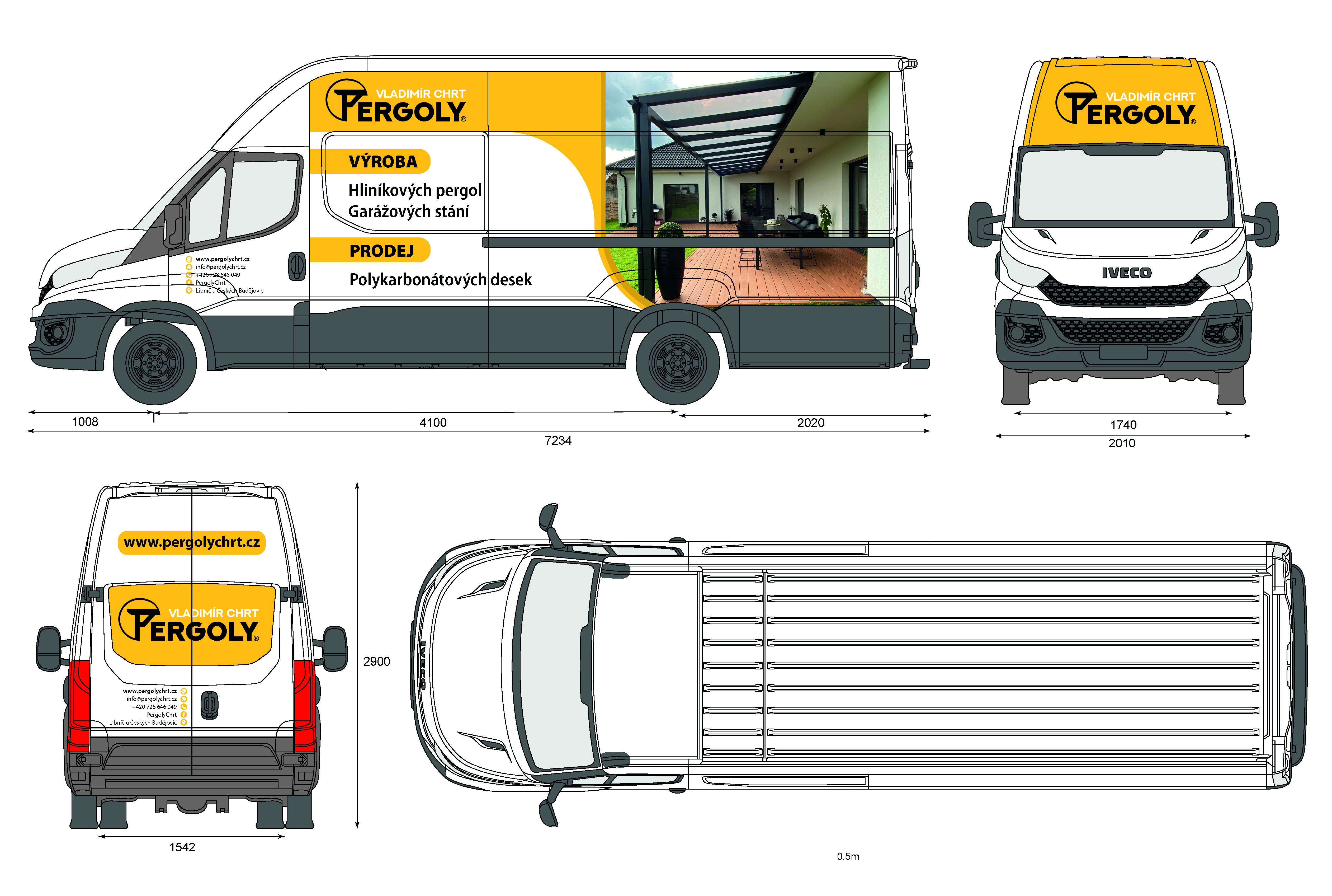 Posouvejte šipky a uvidíte porovnání grafický návrh versus realizovaný polep dodávky: