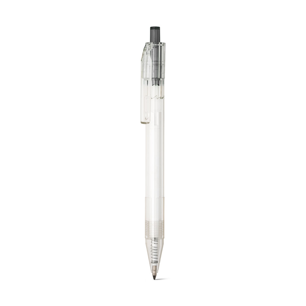RPET kuličkové pero JOJO v průhledném recyklovaném PET plastu s barevným tlačítkem. Kuličkové pero nezatěžující životní prostředí!