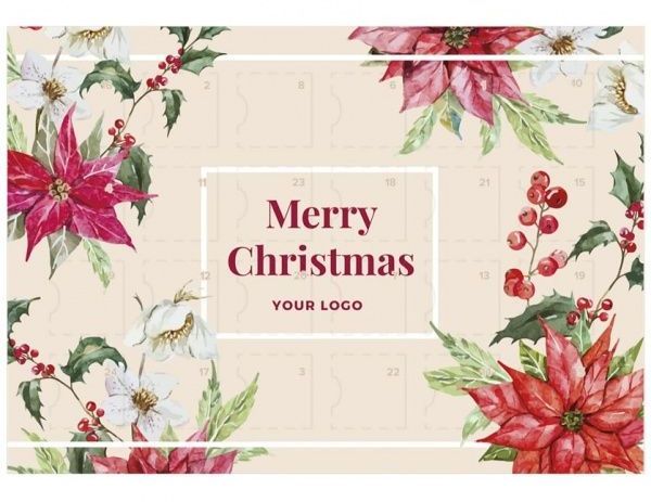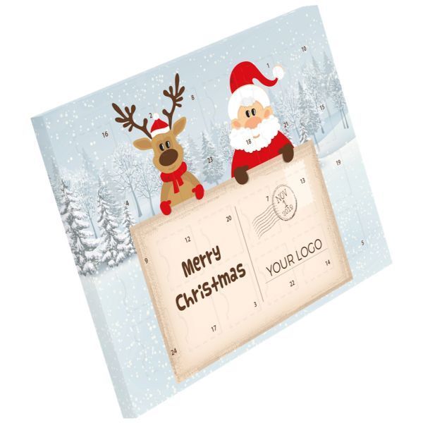 Adventní kalendář YUMM obsahuje 24 okének s mléčnou čokoládou s celkovou váhou náplně 50g. Čokoláda v adventním kalendáři má standardní tvar. Plochu nástěnného kalendáře můžete využít k plnobarevnému potisku vlastním vánočním motivem, firemním logem a reklamním sloganem. Vlastní reklamní motiv dělá z adventního kalendáře nepřehlédnutelný reklamní předmět.