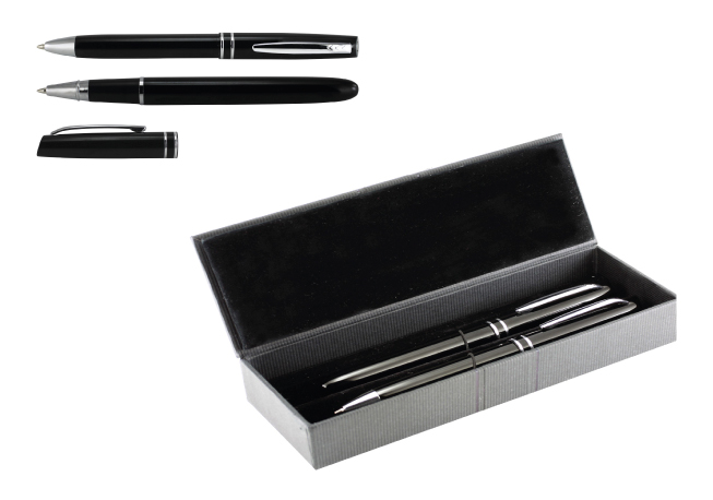 Sada kovového kuličkového pera a rolleru v černém provedení. Doplňky ve stříbrné barvě. Součástí balení je elegantní dárkový box.