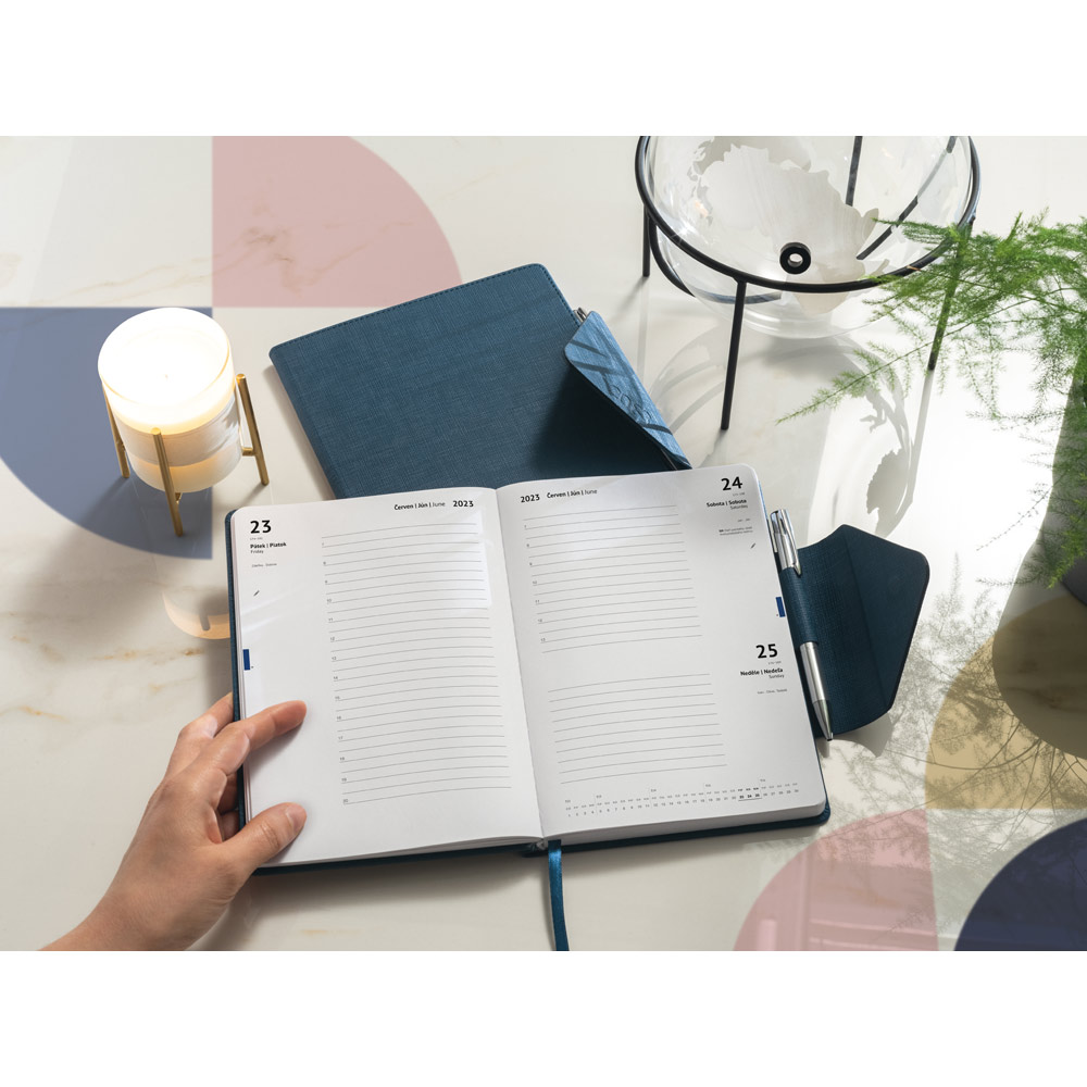 Diář A5 BLUE IVY z imitace kůže s magnetickým zapínáním a poutkem na pero, které je součástí balení. Dodáváno v obalu z netkané textilie. Elegantní diář s praktickým zapínáním na magnet s možností potisku.