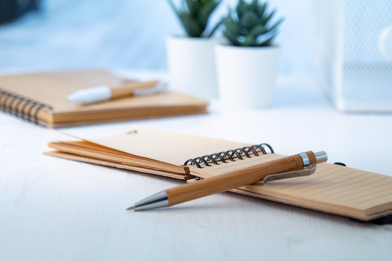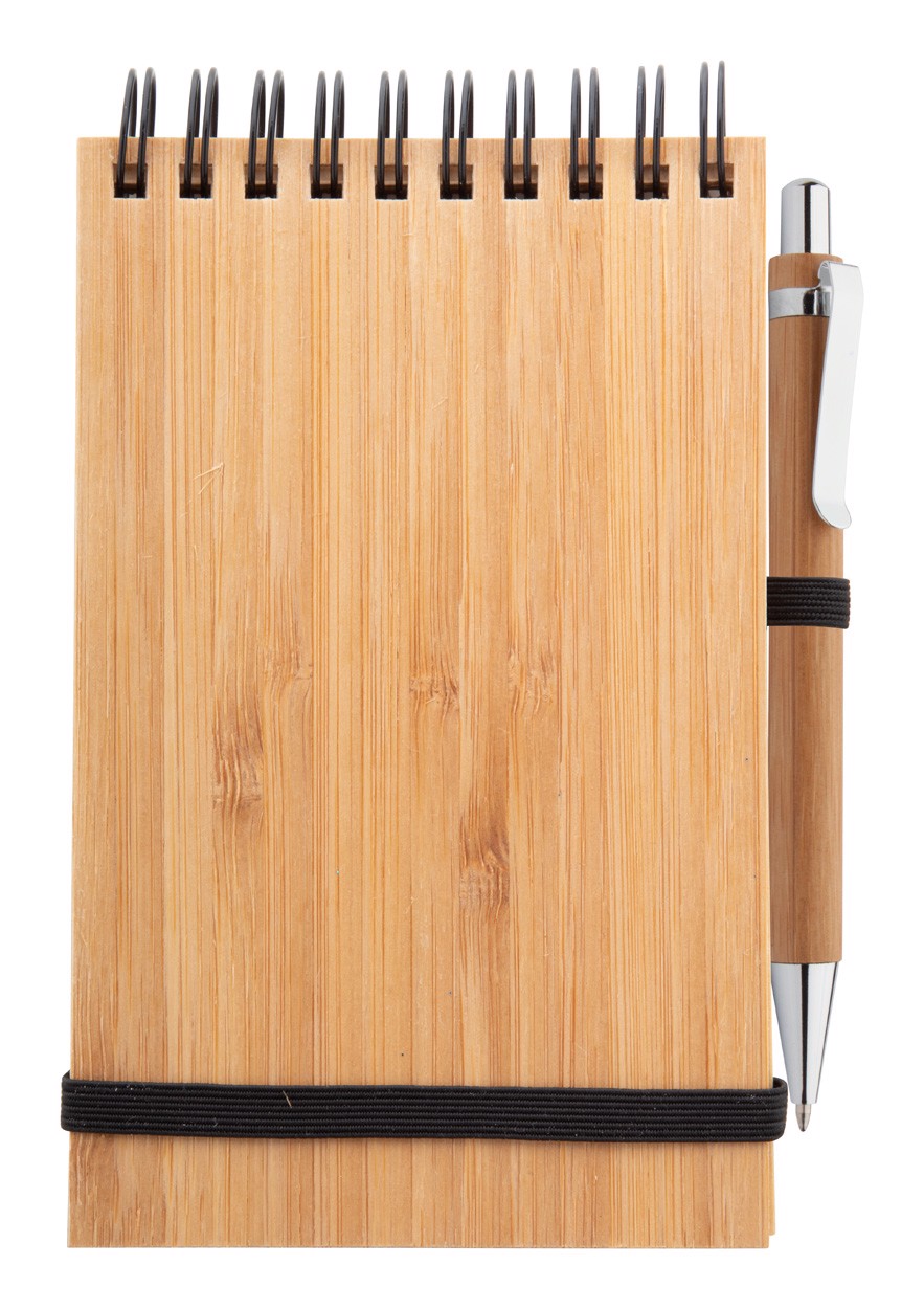 Bambusový spirálový zápisník A6 OAK II. s deskami z bambusu a 70ti linkovanými listy, s bambusovým kuličkovým perem s modrou náplní. Krásný ekologický dárek pro Vaše klienty či obchodní partnery!
