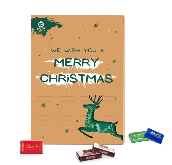 Nástěnný adventní kalendář POPPS je naplněný 24 mini čokoládovými tyčinkami Lindt v nejjemnější mléčné čokoládě ve 3 svátečních barvách. Plochu nástěnného kalendáře můžete využít k plnobarevnému potisku vlastním vánočním motivem, firemním logem a reklamním sloganem. Vlastní reklamní motiv dělá z adventního kalendáře nepřehlédnutelný reklamní předmět.