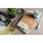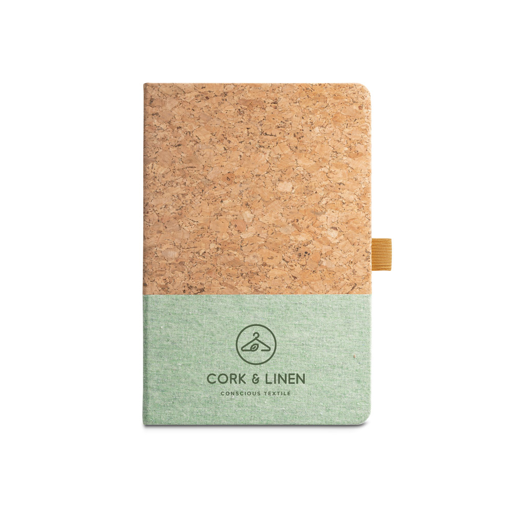 Poznámkový blok TIMBER ve formátu A5 s obalem z korku, spodní část obalu ze lnu. Tento zápisník má 192 linkovaných listů v barvě slonoviny z papíru vyhovujícího zásadám udržitelného rozvoje lesních porostů. Obsahuje držák na pero (pero není součástí balení). Dodáváno v obálce z kraftového papíru s nálepkou.