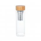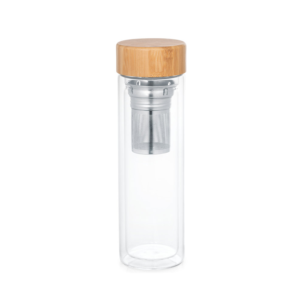 Borosilikátová skleněná lahev PRETTY s dvojitou stěnou a bambusovým uzávěrem. Obsahuje dva infuzéry z nerezové oceli. Lahev má kapacitu až 490 ml. Po odstranění víčka je možné mýt v myčce. Dodáváno v papírové krabičce. Vysoce kvalitní láhev do práce či pro volný čas!