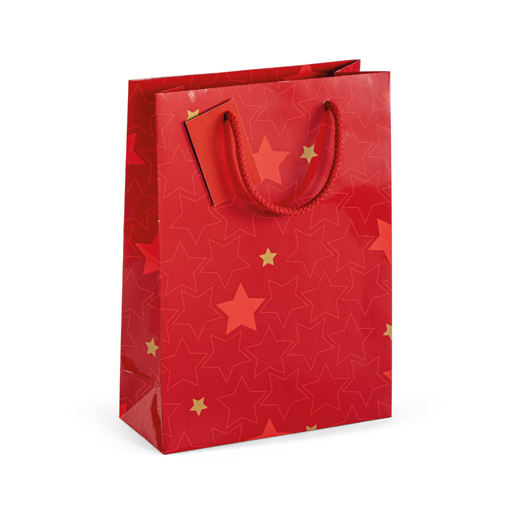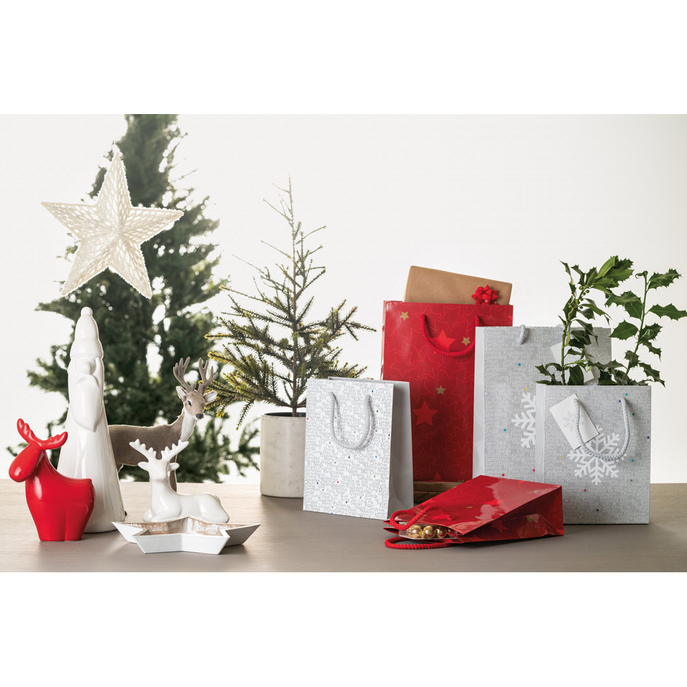 Střední papírová taška WINTER s lesklým laminováním (170 g/m²). Luxusní dárková papírová taška na drobné vánoční dárky. V této tašce budou i ponožky luxusním dárkem! Taška má kartonové dno a kartičku na jméno/visačku. Visačku je možné na zadní straně potisknout.