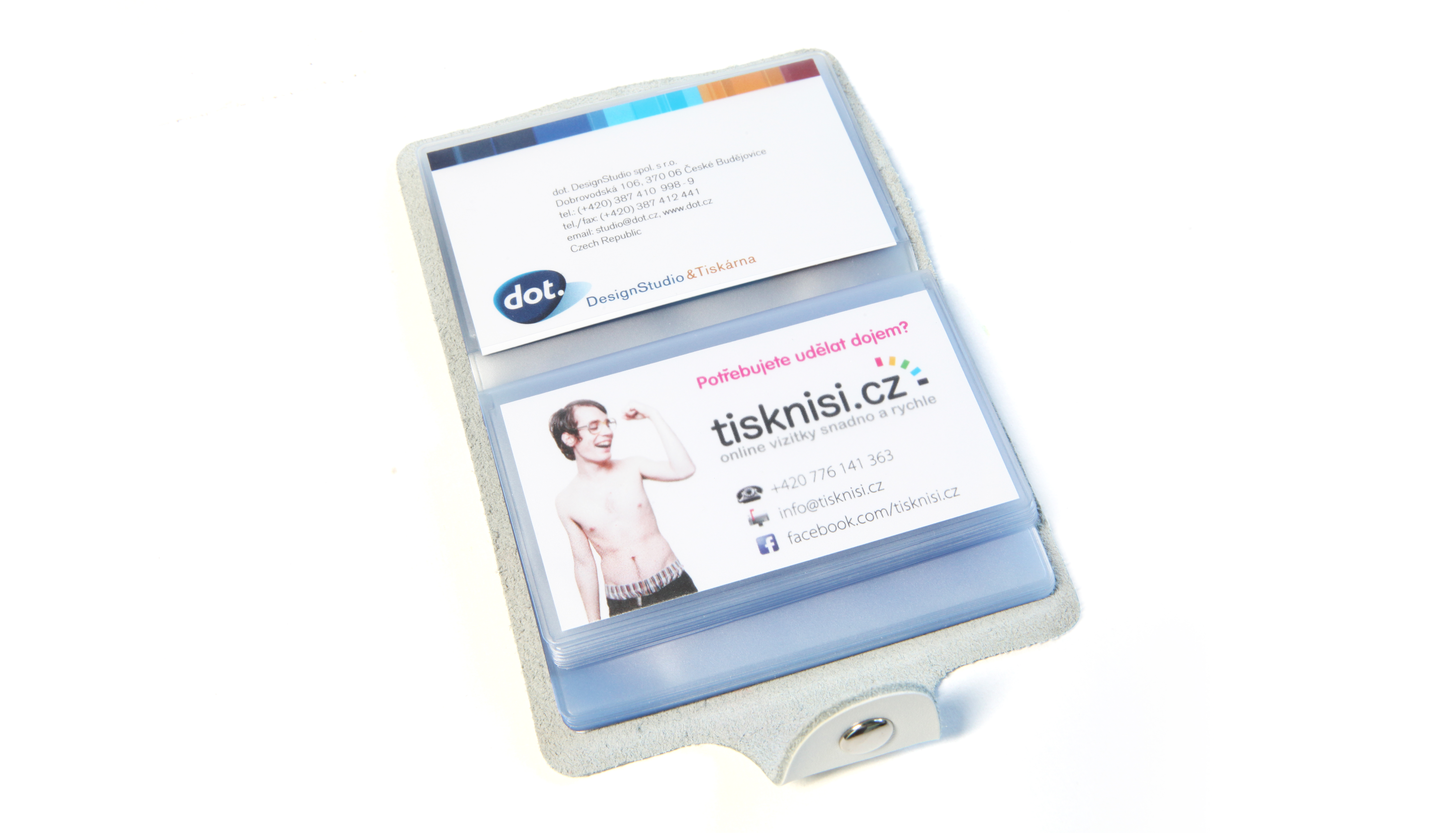 Stylový dámský vizitkář z pravé kůže do kapsy bílé barvy. Kapacita na 26 ks vizitek, váha 120g, rozměry 10,5 x 7,5 cm, se zapínáním na cvoček.