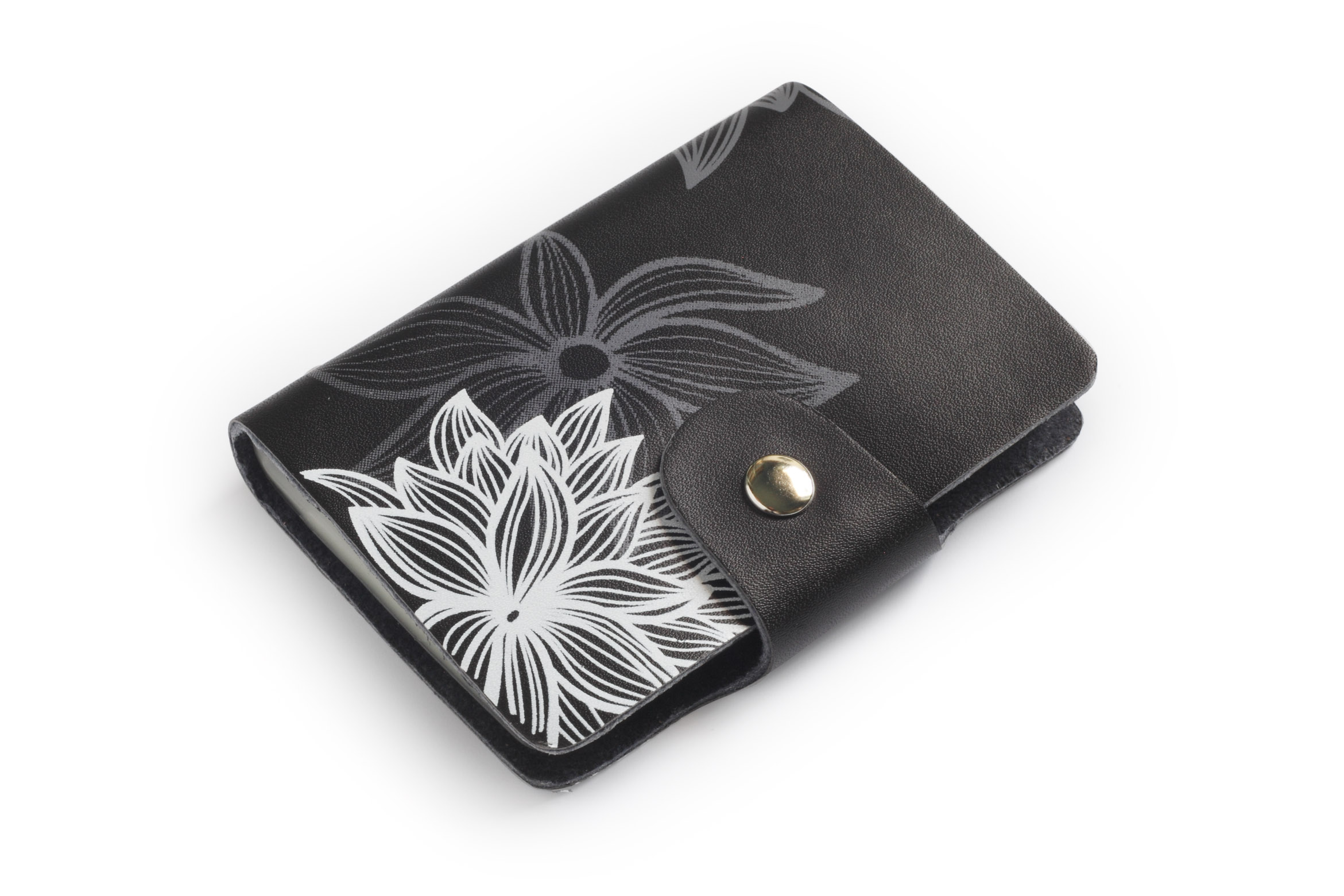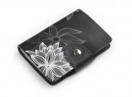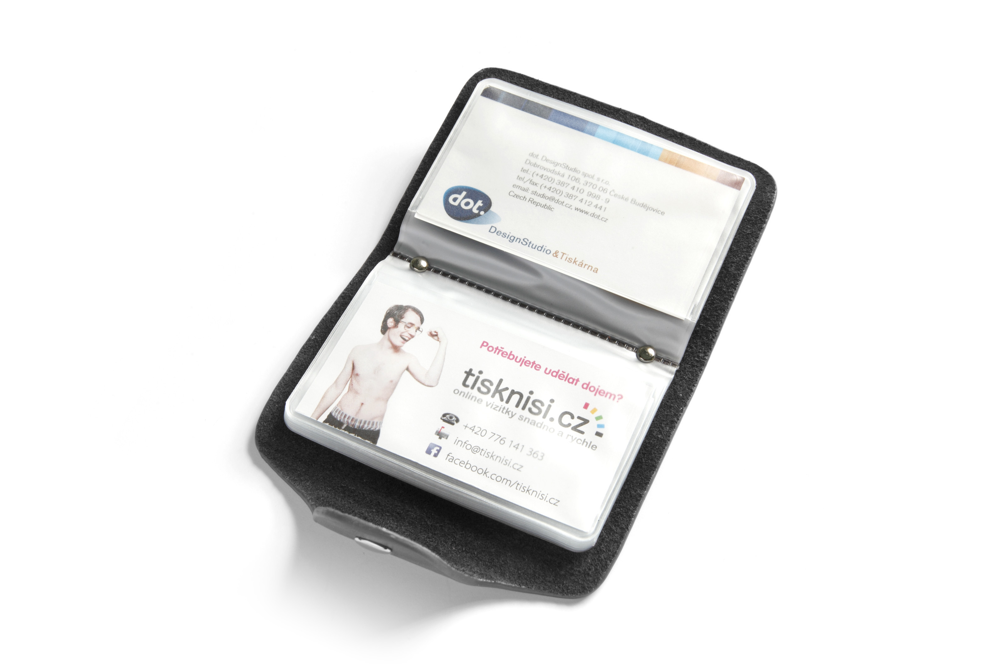 Stylový dámský vizitkář z pravé kůže do kapsy černé barvy. Kapacita na 26 ks vizitek, váha 120g, rozměry 10,5 x 7,5 cm, se zapínáním na cvoček.