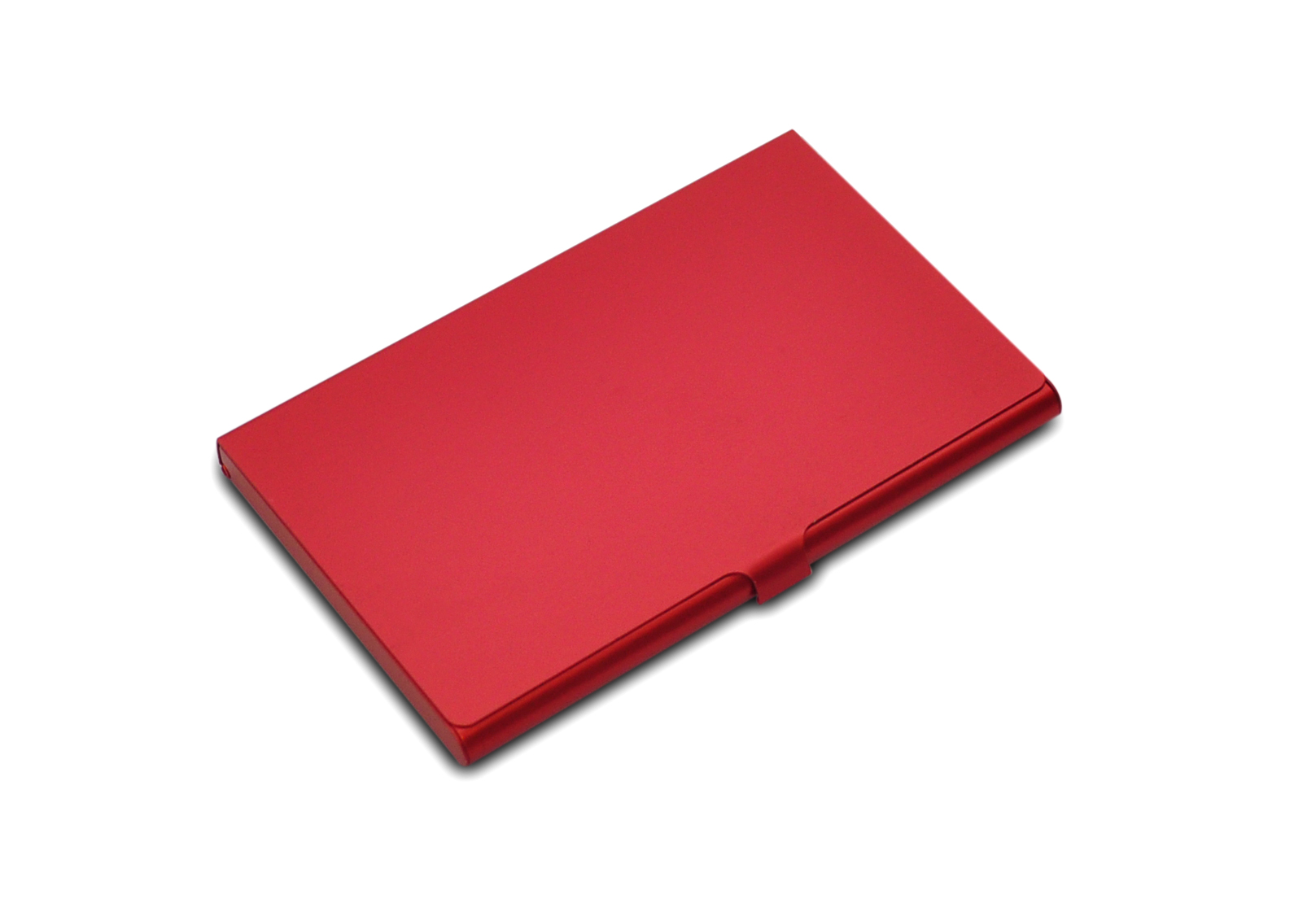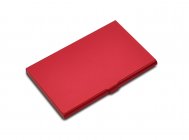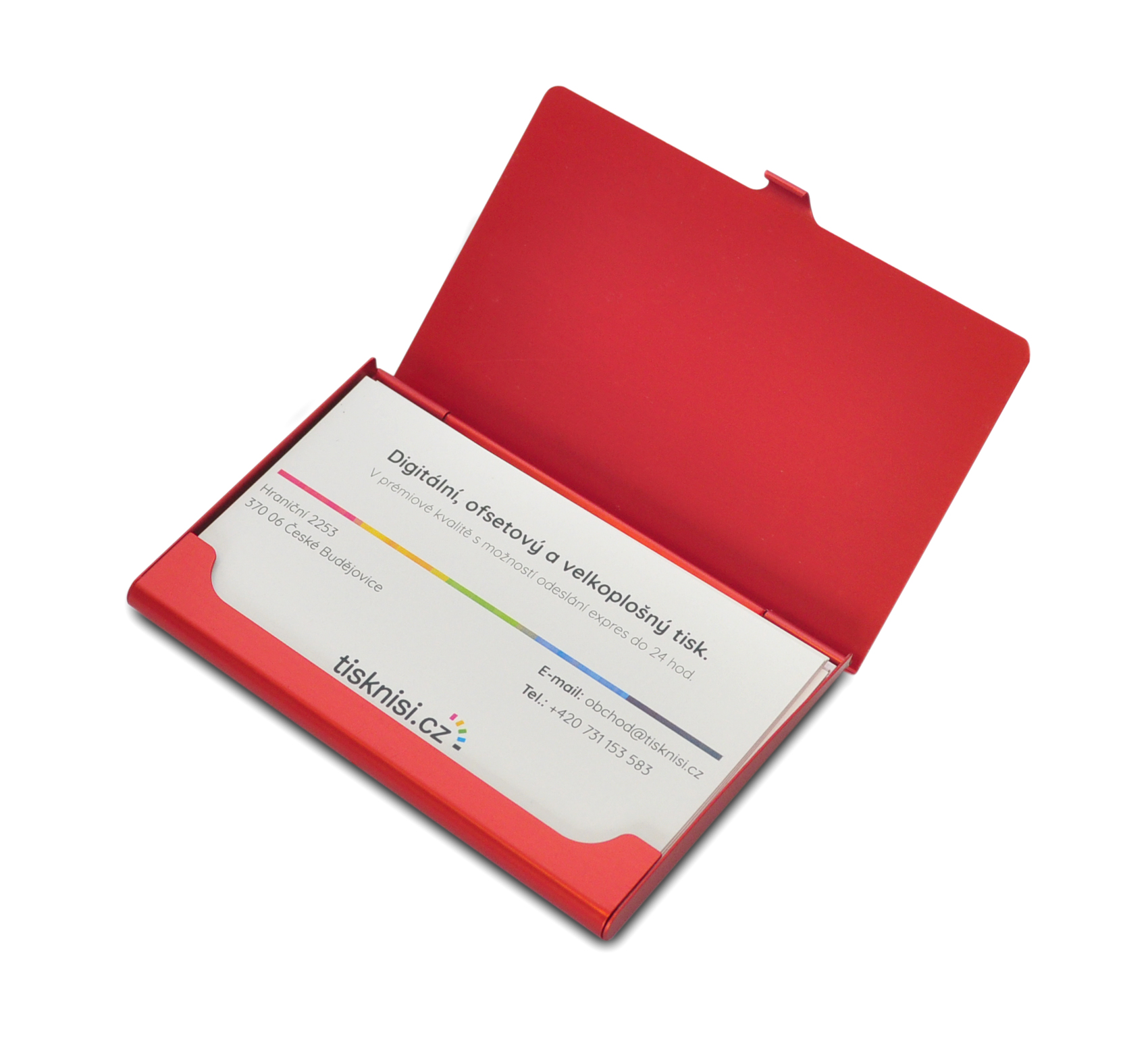 Kvalitní a pevné kovové pouzdro na vizitky červené barvy na 20 - 25 ks vizitek dle gramáže. Váha 15g, rozměry 95 x 60 mm, uzaviratelné na zobáček, baleno v papírové krabičce.