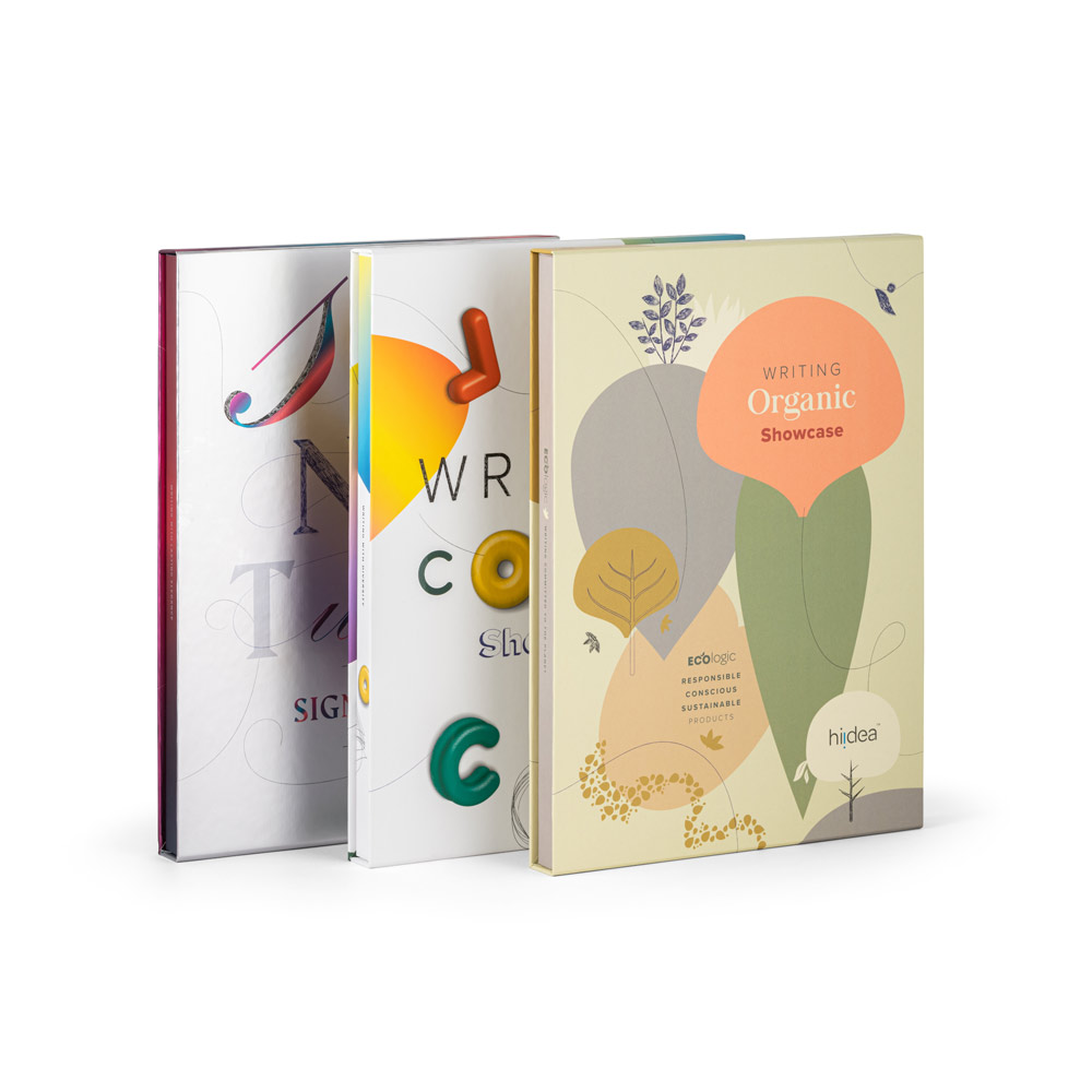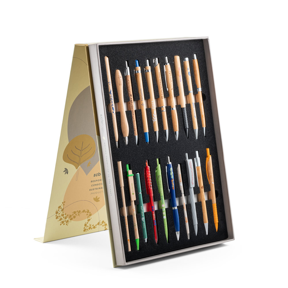 Kromě jeho hlavní funkce lze tento kufřík vystavit do vitríny, což vám umožní prezentovat tyto produkty na akcích. Zahrnuje kuličková pera z bambusu, pšeničné slámy, korku, dřeva, rPET a kraftového papíru. Vše přizpůsobené různým technikám tisku a kreativním stylům.