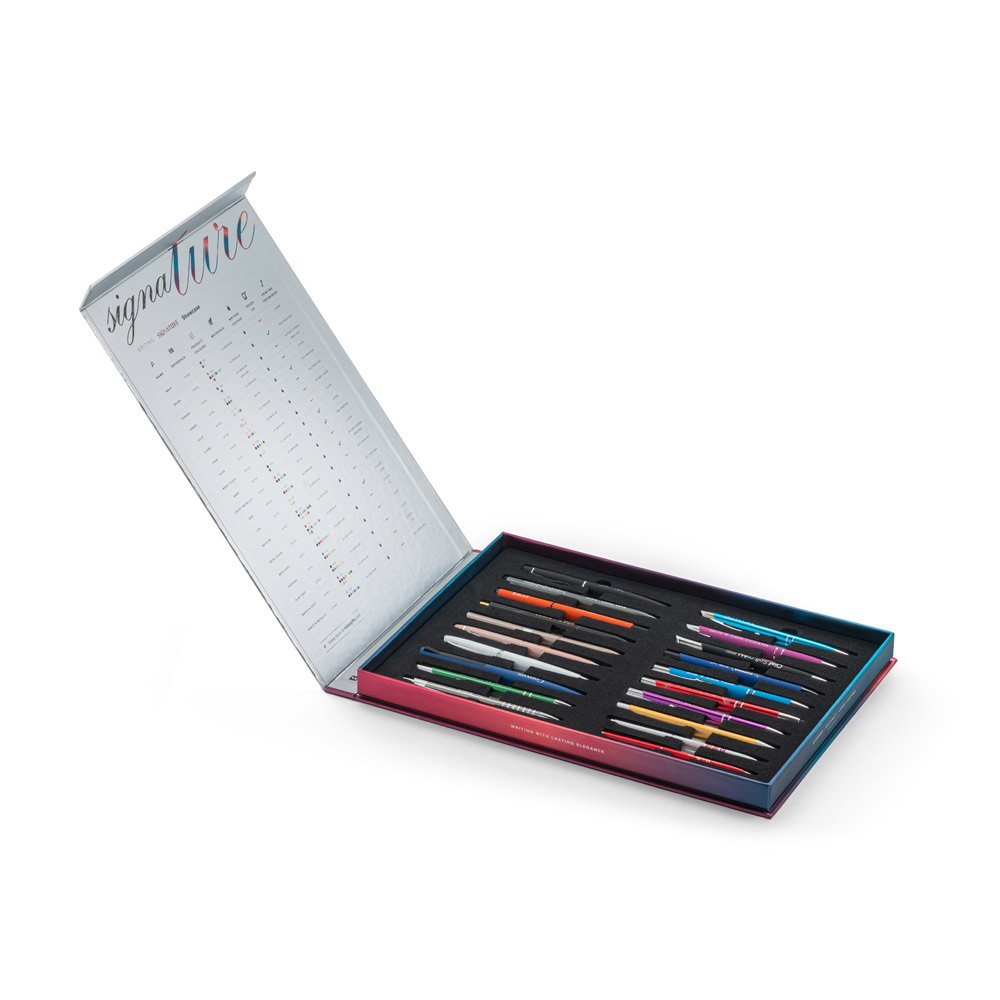 Kromě hlavní funkce lze tento kufřík vystavit do vitríny, což umožňuje vystavovat tyto produkty na akcích. Zahrnuje kuličková pera se širokou škálou barev, přizpůsobené různým technikám tisku a kreativním stylům. Doplňte tento vzorník o vzorník barevných per a vzorník organických per a prezentujete kompletní kolekci vašich kuličkových per.