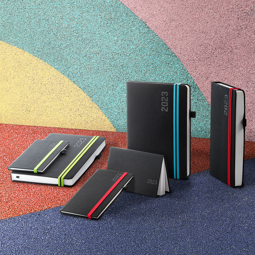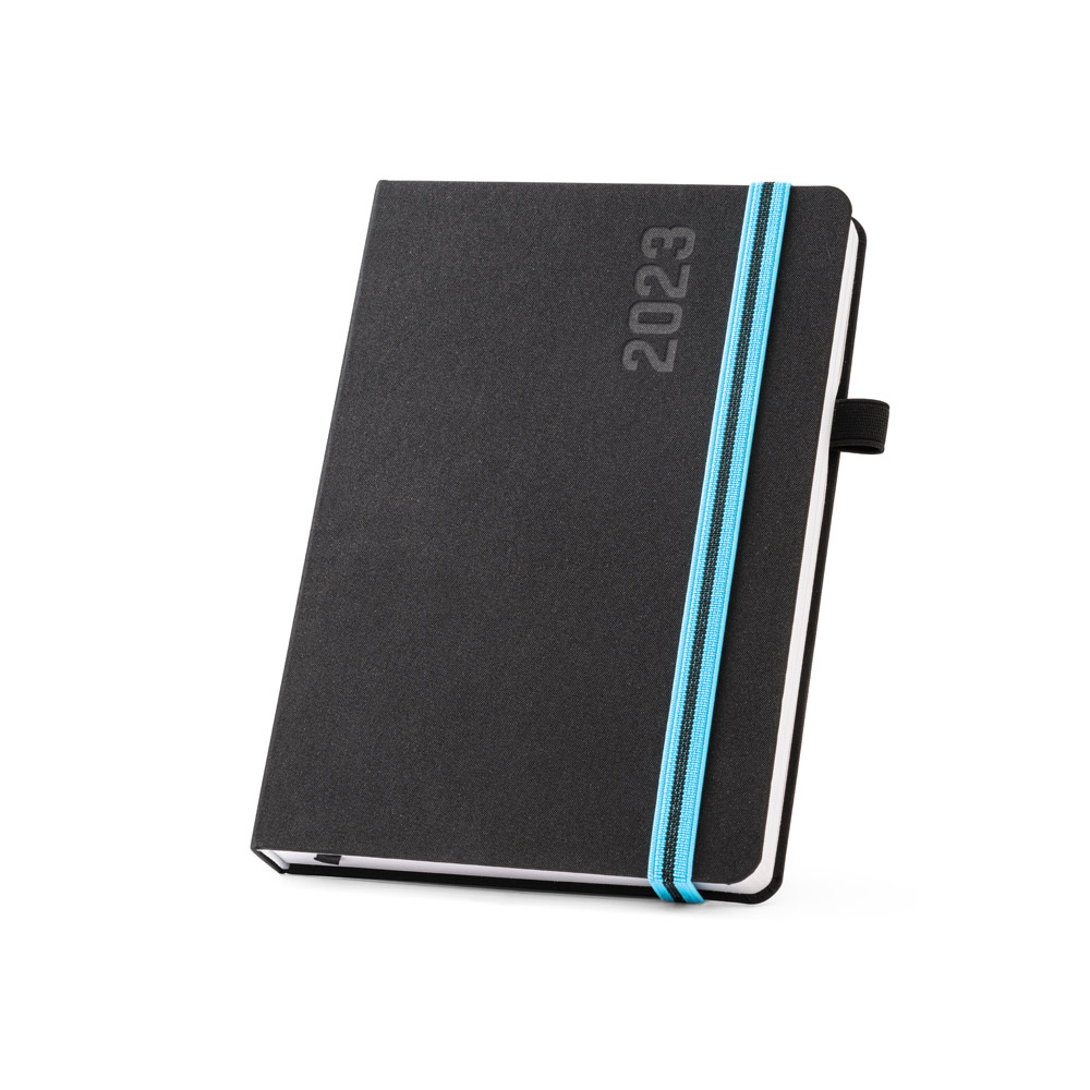 Diář velikosti A5 z polyesterové tkaniny, s barevnou gumičkou a praktickým poutkem na pero. Tři barevné varianty gumičky. Možnost potisku.