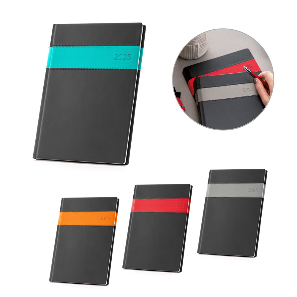 Diář B5 TRUE COLORS z imitace kůže s atraktivním barevným pruhem. Na vyžádání možnost ražby loga do kůže za příplatek.