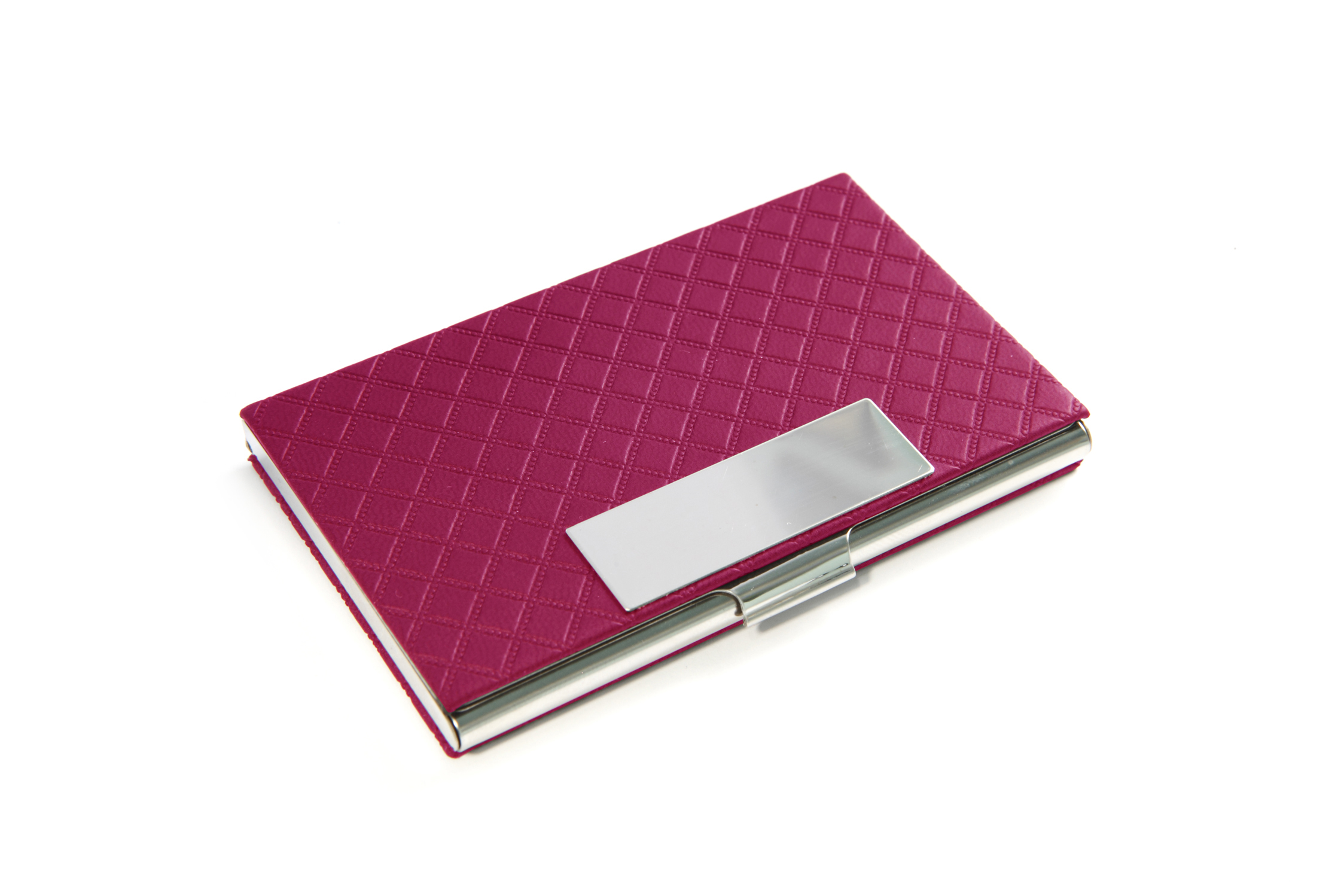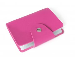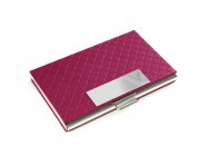 Luxusní pouzdro na vizitky v hliníkovém a koženém provedení s jemnou strukturou ražby, v růžové barvě. Velmi pěkný detail, možnost vložit 15 až 20 ks vizitek dle gramáže, váha 75 g, rozměry 9,3 x 6 x 2 cm, magnetické uzavírání, materiál kůže / broušený hliník. Baleno v papírové krabičce.
