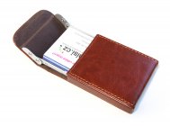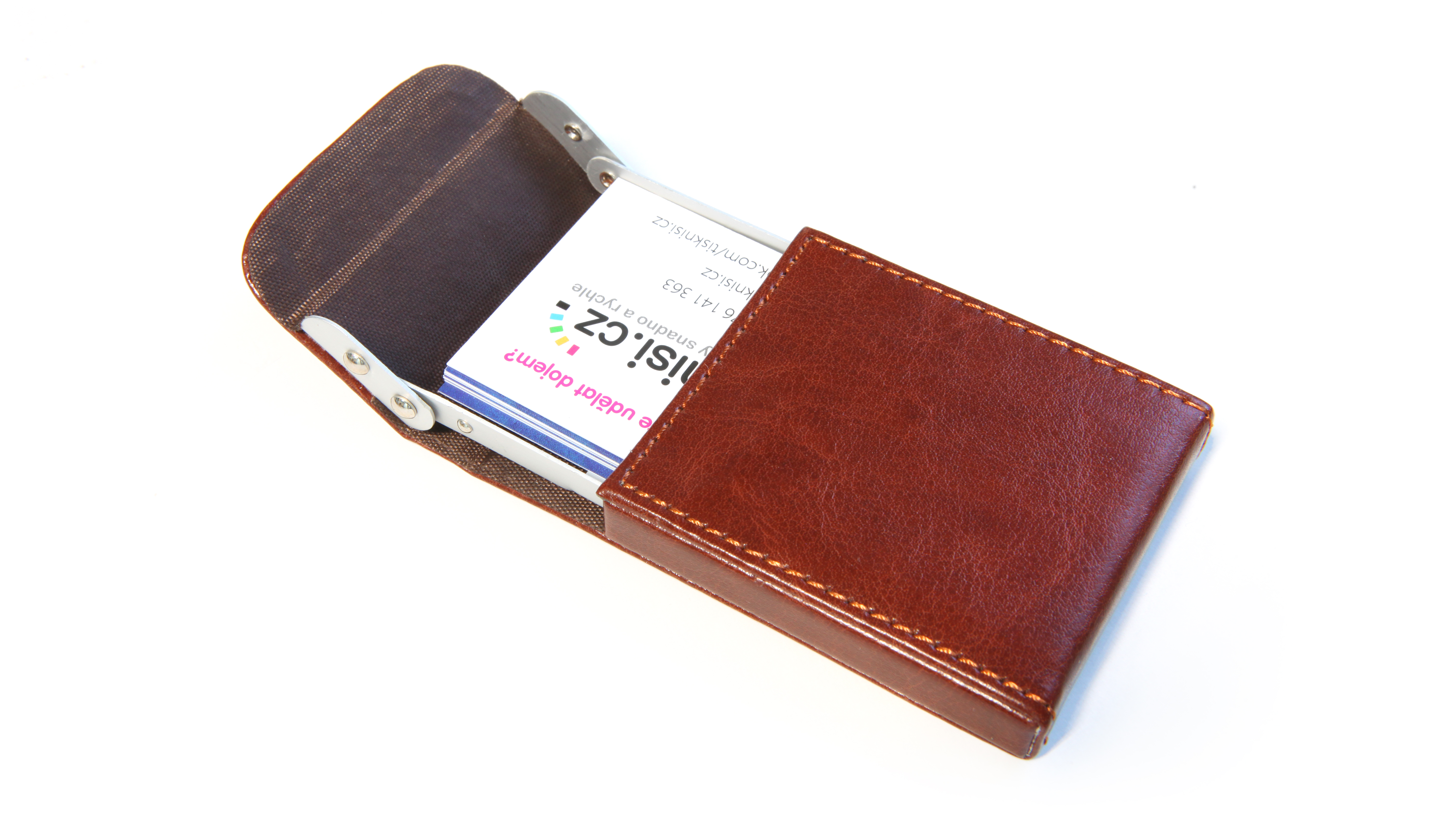 Exkluzivní pánské pouzdro na vizitky v hliníkovém a koženém provedení hnědé barvy. Velmi pěkný detail, možnost vložit 15 až 20 ks vizitek, váha 60 g, rozměry 11 x 8 x 1,7 cm, materiál kůže / broušený hliník.