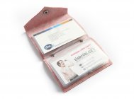 Praktický kapesní vizitkář v provedení imitace kůže. Kapacita na 12 ks vizitek, váha 32 g, rozměry 10,5 x 8,5 cm, se zapínáním na cvoček.