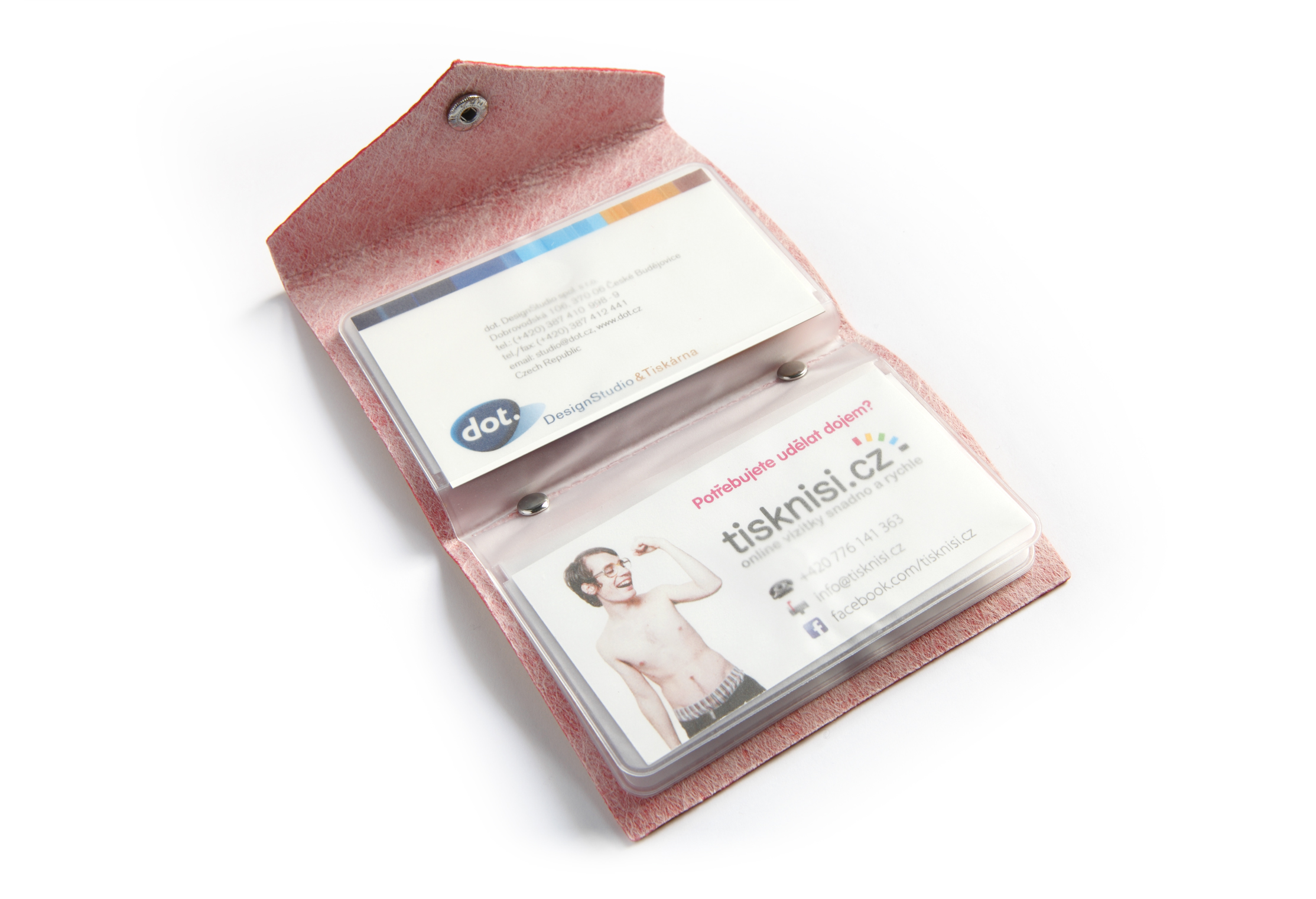 Praktický kapesní vizitkář v provedení imitace kůže, černé barvy. Kapacita na 12 ks vizitek, váha 32 g, rozměry 10,5 x 8,5 cm, se zapínáním na cvoček.